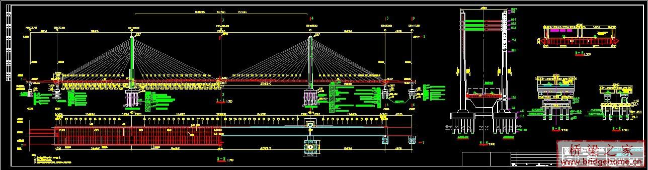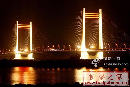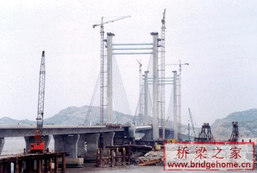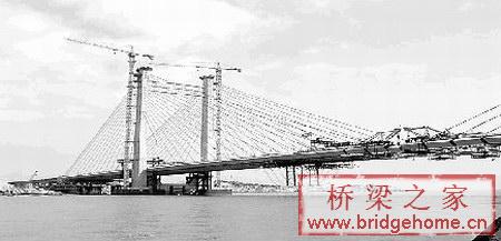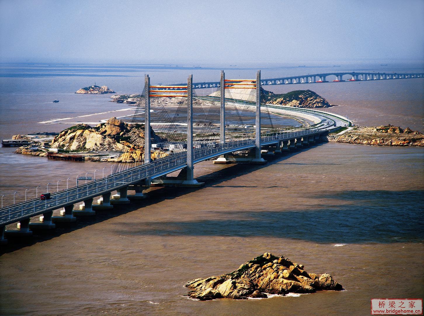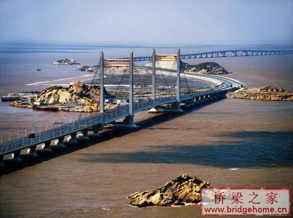颗珠山大桥位于东海大桥港桥连接段,东接颗珠山岛,西连小城子山港区,距上海市南汇区芦潮港约30km。颗珠山岛属鸡爪型地貌,其东侧发育-呈NEE走向的深槽,深槽泥面标高自北向南逐渐降低,最深处约-40m。该区域水动力条件非常复杂,经方案比选确定采用在深槽处不设桥墩的双塔双索面三跨叠合梁斜拉桥。其中,主跨332m,边跨139m,边跨两端布置长50m的过渡孔。