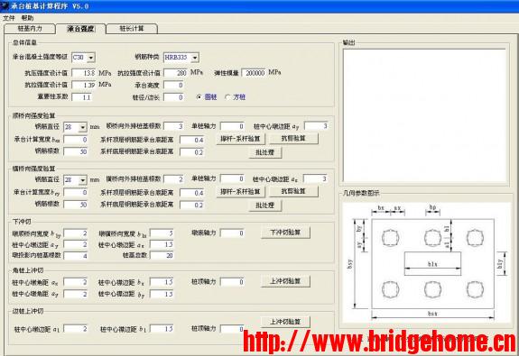 (二○一○年四月五日) 1 简介 欢迎使用承台桩基计算程序 V5.0! 本程序的主要功能包括: l m法计算桩基内力,桩基形式包括斜桩,方桩,管桩;可考虑桩身土压力(或波浪力)荷载 l 承台强度验算,包括撑杆-系杆体系,抗剪,下冲切,角桩上冲切,边桩上冲切 l 桩长设计和验算 本程序依照《公路桥涵地基与基础设计规范》(JTG D63?007)(以下简称《基础规范》)和《公路钢筋混凝土与预应力混凝土桥涵设计规范》(JTG D62?004)(以下简称《公桥规范》)编制,因此原则上仅适用于公路桥涵设计。作者在开发中亦参考了《铁路桥涵地基与基础设计规范》(TB10002.5-2005)部分内容,因此铁路桥涵设计人员也可在明晰程序相关参数含义的前提下参考使用。 注意:本程序中,需要用户输入(或选择)的数据项一律用蓝色显示,由程序自行计算确定的数据项则一律用黑色显示。另外,输入输出数据的单位除注明外一律采用kN m制。 2 桩基内力 2.1 输入计算信息 运行承台桩基计算程序V50.exe后,单击分栏 ,程序界面显示如下图所示。 第一步,在AutoCAd中绘制承台底部的桩基平面布置形式,桩基一律用CIRCLE对象绘制,其直径为桩基外径。 单击捕捉桩基布置,程序切换至AutoCAD程序中,选择桩基对应的CIRCLE对象,如下图所示,按鼠标右键确定。 注意:承台桩基计算程序v50for2006用于AutoCAD2006及以下版本,承台桩基计算程序v50for2008用于AutoCAD2006以上版本。若程序提示撁挥写蚩狝utoCAD程序? 请检查是否使用正确的程序版本。 界面自动切换回程序,如下图所示。 此时,程序中已经自动获取桩基的基本信息,包括桩径,平面布置坐标等。 第二步,输入桩基计算信息,下面分别介绍。 桩基形状:如果勾选,则程序将视CIRCLE对象的直径为方桩的边长; AutoCAD绘图单位:可供选择的有m,cm和mm,根据不同的绘图单位,程序自动换算相应的计算信息; 地基土比例系数m 桩端地基竖向抗力系数C0:按《基础规范》表P.0.2-2取值,若填0程序取C0=mh,其中h为地面线以下桩长; 土的平均内摩擦角:桩所穿过土层的平均内摩擦角; 承台类型:可选择为高桩承台和低桩承台,高桩承台可以输入作用于桩顶与地面处的土压力强度q1和q2,详见《基础规范》P95;低桩承台可以考虑承台侧土提供的弹性约束,详见《基础规范》P97; 承台厚度:用于计算低桩承台侧土提供的侧向约束,若不计入填0; 承台顺桥向宽度:用于计算低桩承台侧土提供的横桥向约束,若不计入填0; 承台横桥向宽度:用于计算低桩承台侧土提供的顺桥向约束,若不计入填0; 注意:对于低桩承台侧向土的约束作用,若承台厚度h大于承台埋置深度H,则提供侧向约束的土厚度取承台埋置深度H,且承台底面处水平向土的地基系数c=mH;反之若承台厚度小于承台埋置深度,则提供侧向约束的土厚度取承台承台厚度h,但承台顶底面处水平向图的地基系数分别为c=m(H-h)和c=mH。 桩基砼强度等级 刚度换算系数:桩基抗弯刚度折减系数,旧基础规范取0.67,《公桥规范》取0.95,《基础规范》取0.8,程序默认取0.8,用户可修改; 抗压弹性模量Ec:程序自动根据桩基砼强度等级确定; 成桩方式:分为端承\嵌岩桩,打\沉入摩擦桩和钻\挖孔摩擦桩三类; 睿合凳??沙勺?绞饺范ǎ?昙?痘?」娣丁稰91; 受力方式:用于确定单桩柔度系数计算公式和kh,详见《基础规范》P88和P89; 地面线以上桩长\承台埋置深度:分别对应于高桩承台和低桩承台; 地面线以下桩长\桩基长度:分别对应于高桩承台和低桩承台; 桩基直径或边长 桩基壁厚:若壁厚为0或者壁厚大于桩基半径,则取壁厚为桩基半径(即为实心桩) 桩端最小中心距:根据承台底部的桩基平面布置形式和各桩基的倾角共同确定 EI:单桩的抗弯刚度,?EcI,若采用钢管桩请用户自行计算输入 EA:单桩的抗压刚度,EcA,若采用钢管桩请用户自行计算输入 地面线以上容重:用以由桩顶轴力来计算地面线处的桩基轴力,桩基面积A=EA/Ec 地面线以下容重:用以由地面线处轴力来计算地面线以下不同深度处的桩基轴力,桩基面积A=EA/Ec 第三步,输入承台底的荷载,包括以下部分。 竖向轴力 顺桥向弯矩 横桥向弯矩 顺桥向剪力 横桥向剪力 2.2 输入补充信息 当完成输入计算信息后,程序自动给出桩基顺桥向和横桥向计算宽度b1和桩土变形系数岬募扑愎?蹋?⒔?鞲鲎??氖粜粤杏诔绦蛴疑辖堑谋碇校?缦峦妓?尽? 上表将所有桩基分别按照顺桥向和横桥向进行排序编号便于识别。两表的桩基总数是一样的,但同一根桩基在二表中的序号有别。 注意:顺桥向编号的原则是按桩基Y坐标递增的顺序排序,若有Y坐标相同的情形,则按X坐标递增排序;横桥向编号的原则是按桩基X坐标递增的顺序排序,若有X 坐标相同的情形,则按Y坐标递增排序。 若有斜桩,桩侧有土压力(或波浪力)荷载,用户可自行在桩基属性表中输入,各参数的含义如下图所示。 若多个桩基有土压力(或波浪力),可通过程序界面上的桩侧荷载栏来批量输入,如下图所示。 若输入有桩侧荷载,但是用户不想计入桩侧荷载的效应,则可以通过取消计入效应复选框来实现。在批处理多组荷载时,某些工况是没有土压力或波浪力的,则可以通过分批次选择并采用计入效应复选框来实现是否计入桩侧荷载的效应。 注意,与修改桩侧荷载类似,直接在桩基属性表中修改参数仅是针对所在行的单个桩基属性进行修改,而在属性表外进行各项计算信息的修改则会改变所有的桩基属性,而程序最终采用的计算数据是采