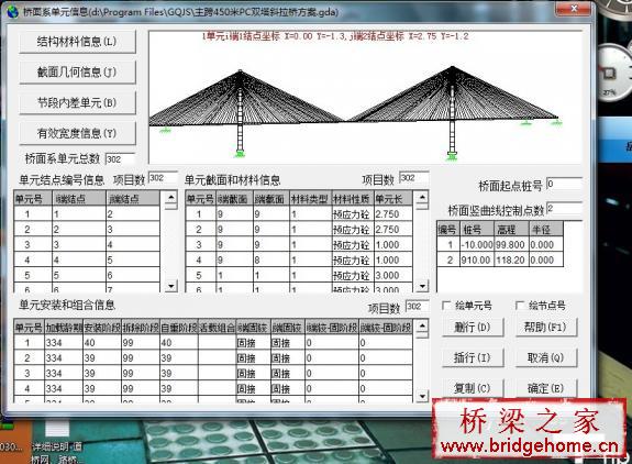 公路桥梁结构设计系统, 本系统适用于任意可作为平面杆系处理的桥梁结构体系,如:简支梁、简支-连续梁、连续梁、连续刚构、连续拱、桁架结构、T型刚构、斜拉桥以及框架结构等。桥梁材料可以是预应力混凝土、钢筋混凝土、混凝土、钢、砖石结构以及上述各种结构体系的组合。结构的不同构件可采用不同的材料类型。结构体系可分阶段形成,各阶段可具有不同的静力图式。系统能对大跨径桥梁各种目前常用的施工工艺,如:悬臂施工、顶推法施工、临时支架组装等结构体系,进行施工阶段和使用阶段综合分析。系统采用了两端带刚臂的偏心梁单元,因而考虑了多根杆件交汇于一个结点的结点刚域效应,计算比较准确。
