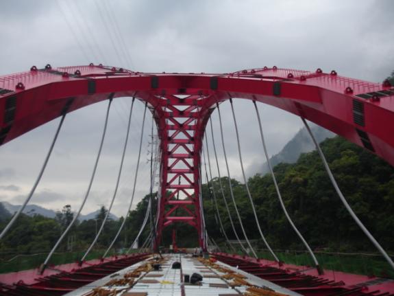 图片:DSC02824.JPG 新笃铭桥位于谷关温泉区入口,跨越大甲溪与支流十文溪汇流处,全长155公尺、宽11公尺,为单跨钢拱桥,总共使用1800吨钢材,桃红色涂装与蓝天绿地形成强烈对比,将成为谷关新地标。 图片:036.jpg ![]() |